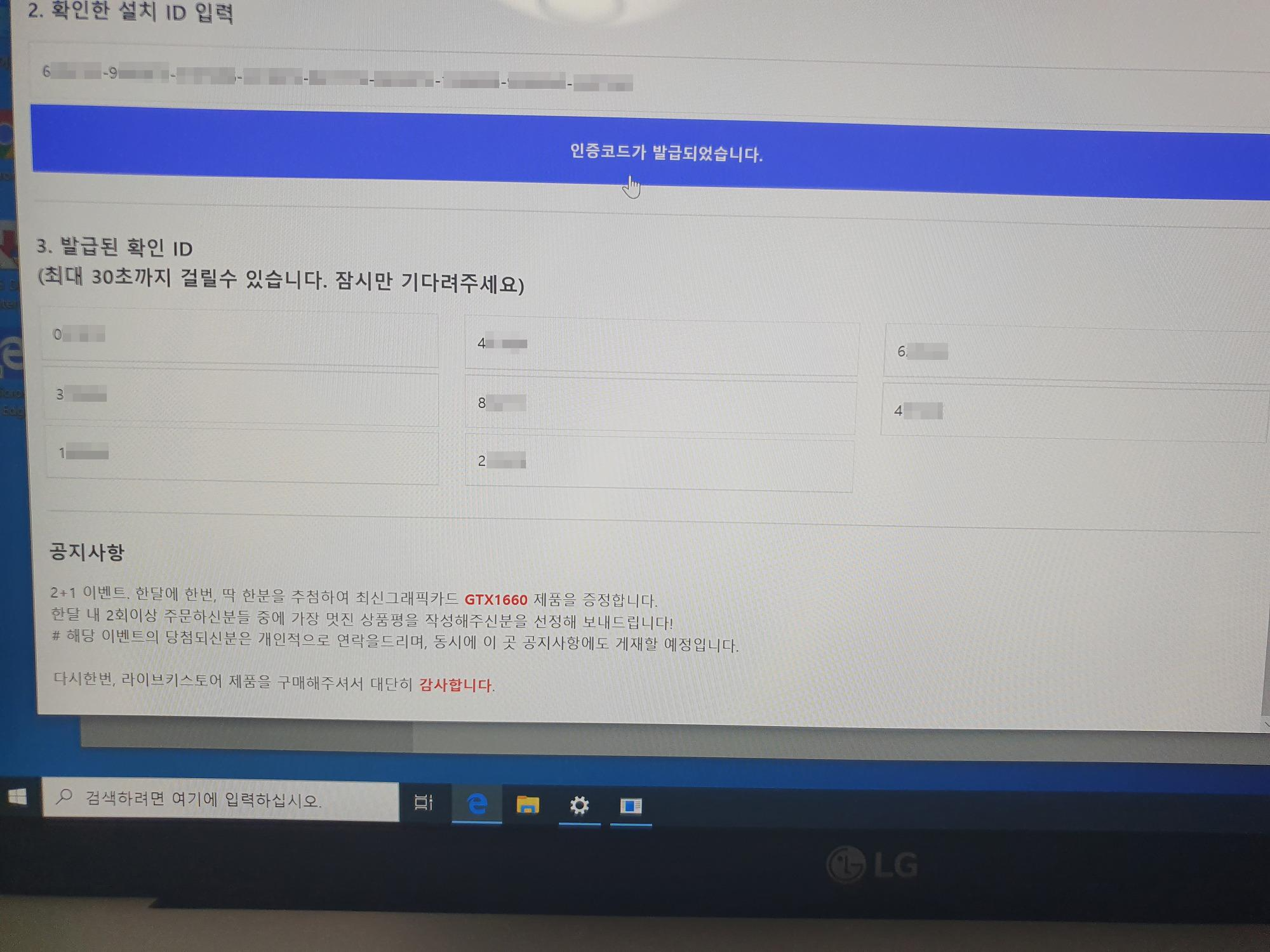 그 63글자를 입력하면 인증코드가 발급되었다는 말이 뜹니다.